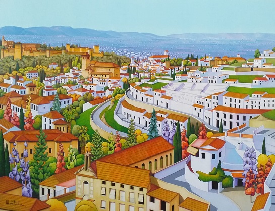 Chico Montilla organiza un trabajo plástico ágil, alegre, donde expresa la visión organizada de la ciudad, la imagen extraída para trasplantarla como estructura de figuras angulares encajadas. Expone el pintor una concepción de la comprensión del tiempo presente, ordenado, impoluto, idealizado, sumido en un cromatismo repetitivo y familiar a todos. Pero el artista incorpora magia en el cuadro, duda e interés sobre la humanidad que en ese medio habita. La ausencia de la figura humana, el olvido de la curva de desarrollo libre sin regla constante, hace que el ánima del espectador lo introduzca en la pieza, creando una superficie invisible que genera interés en la obra. La vida es reflejada en la representación del medio vegetal, en los cipreses, como manchas alargadas, todo bajo un cielo de azul disuelto. Ocres, verdes, dorados y azules bañan el paisaje, creando un entramado lógico que describe el color de Granada, la luz tenue de sus atardeceres, o cuando nace tibia y limpia. Intercala el pintor los tonos de forma armónica en el cuadro, consiguiendo concluir composiciones atractivas, de contemplación rítmica, que comunican el halo que fluye en el paisaje granadino. La obra de Chico Montilla parte de las entrañas de las vanguardias del siglo XX, siendo expresada como elaboración plástica fresca y actual.