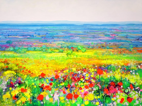 La pintura de Ulpiano Carrasco es la manifestación del poder lírico, tonos intensos y puros proclamando la libertad del trazo que los conjuga. Hay ritmos y vibraciones musicales en cse movimiento apasionado del pincel cuando ejecuta y fija la impronta dinámica de su huella en manchas, formas y volúmenes, como si de una batuta imaginaria se tratara. Fiesta de colores frescos que celebra imágenes seculares. Campos y tierras castellanas adquieren la brillantez luminosa dictada por un estado de ánimo, una mezcla de humores compulsivos ante la luz, el aire libre; grandes espacios abiertos al impulso gozoso de plasmar la imagen en un arrebato de formas que son gestos de color: verdes, negros, bermellones, blancos, ocres, intérpretes de la audacia con que son enérgicamente armonizados hacia lo esencial por el impulso emocional y emocionado del ejecutante.